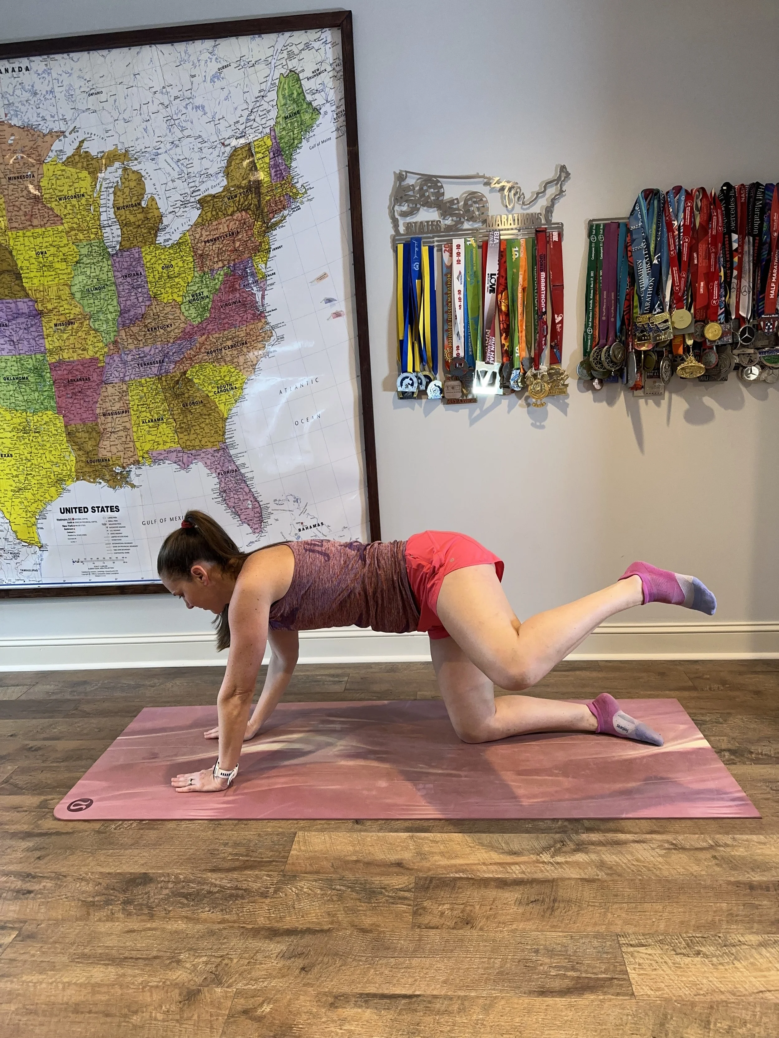 Start in a hands and knees position. Lift one leg out to the side and then bring it back down. Repeat for 2-3 sets of 10 reps.