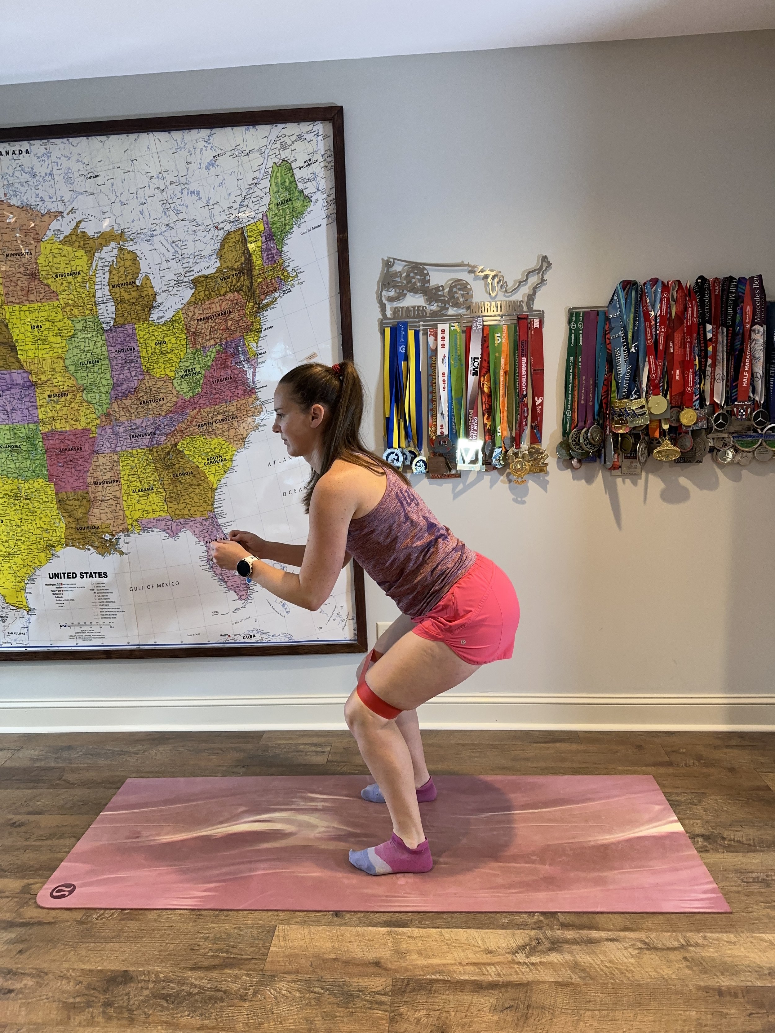 Place a band around your thighs. Squat down as far as you can comfortably and then return to the starting position. Repeat for 2-3 sets of 10 reps.
