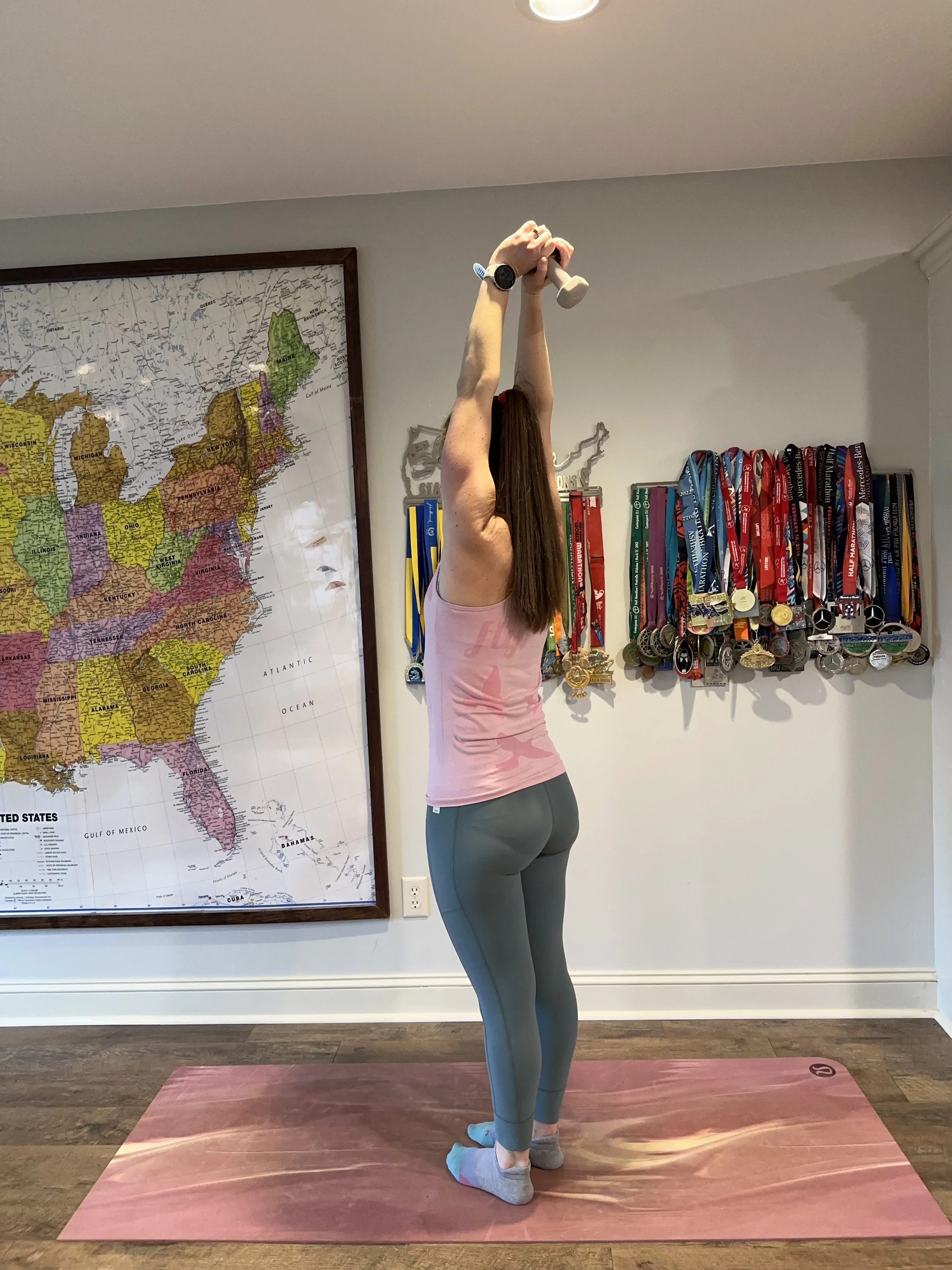 Start by holding a dumbbell in each hand and straightening your arms overhead. Slowly lower one dumbbell down to your shoulder, bring it back overhead, and then lower the other dumbbell to your shoulder. Alternate back and forth.