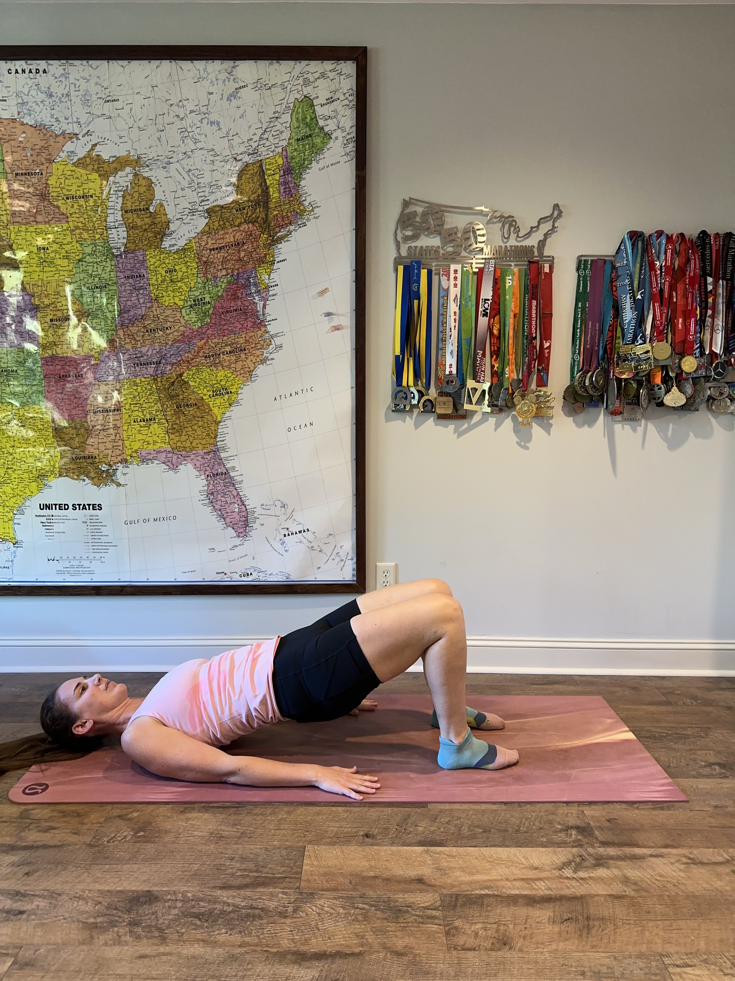 Lie on your back with both knees bent. Lift your hips up off the ground and then lower them back down. Repeat 20-30 times.