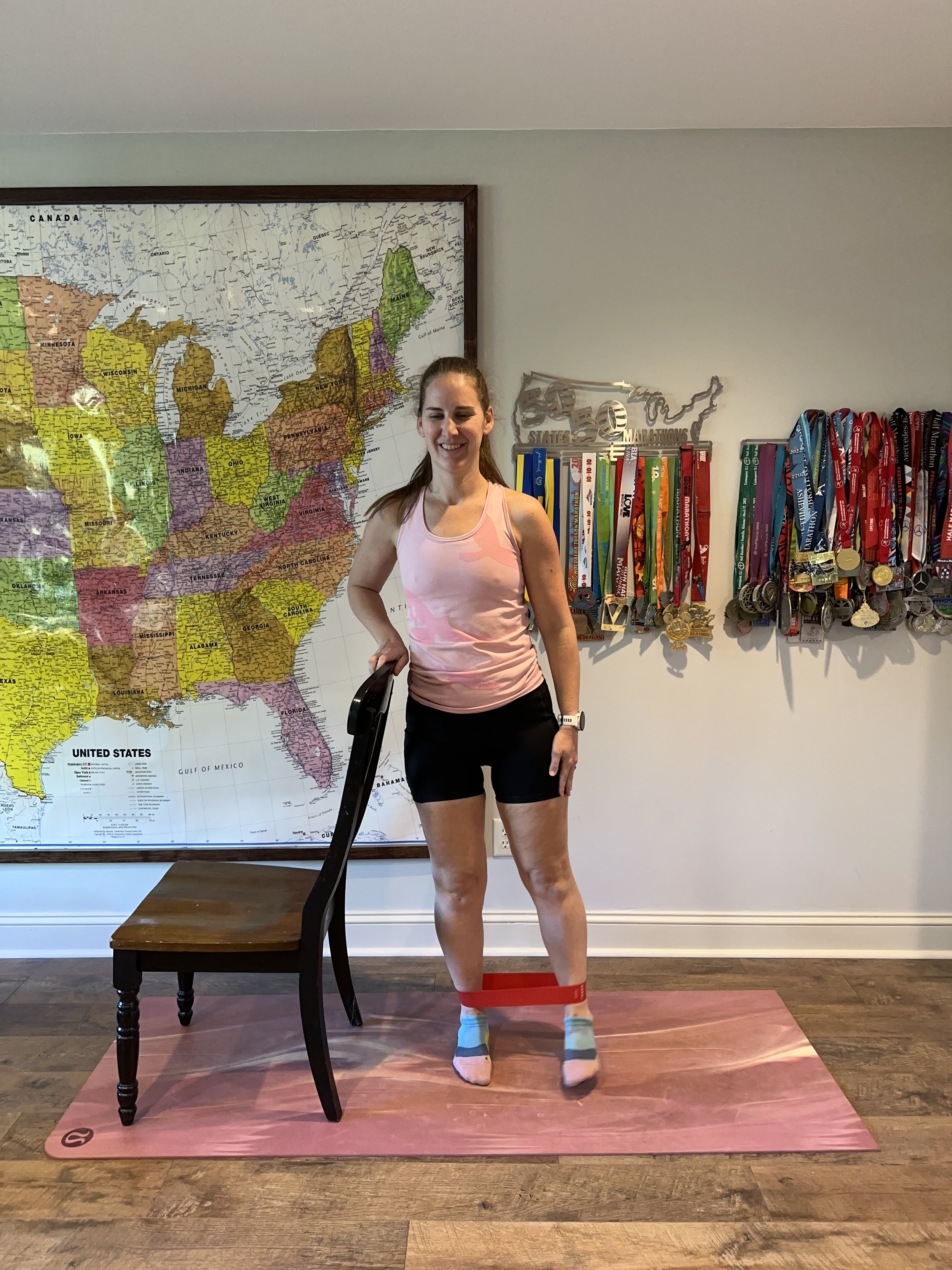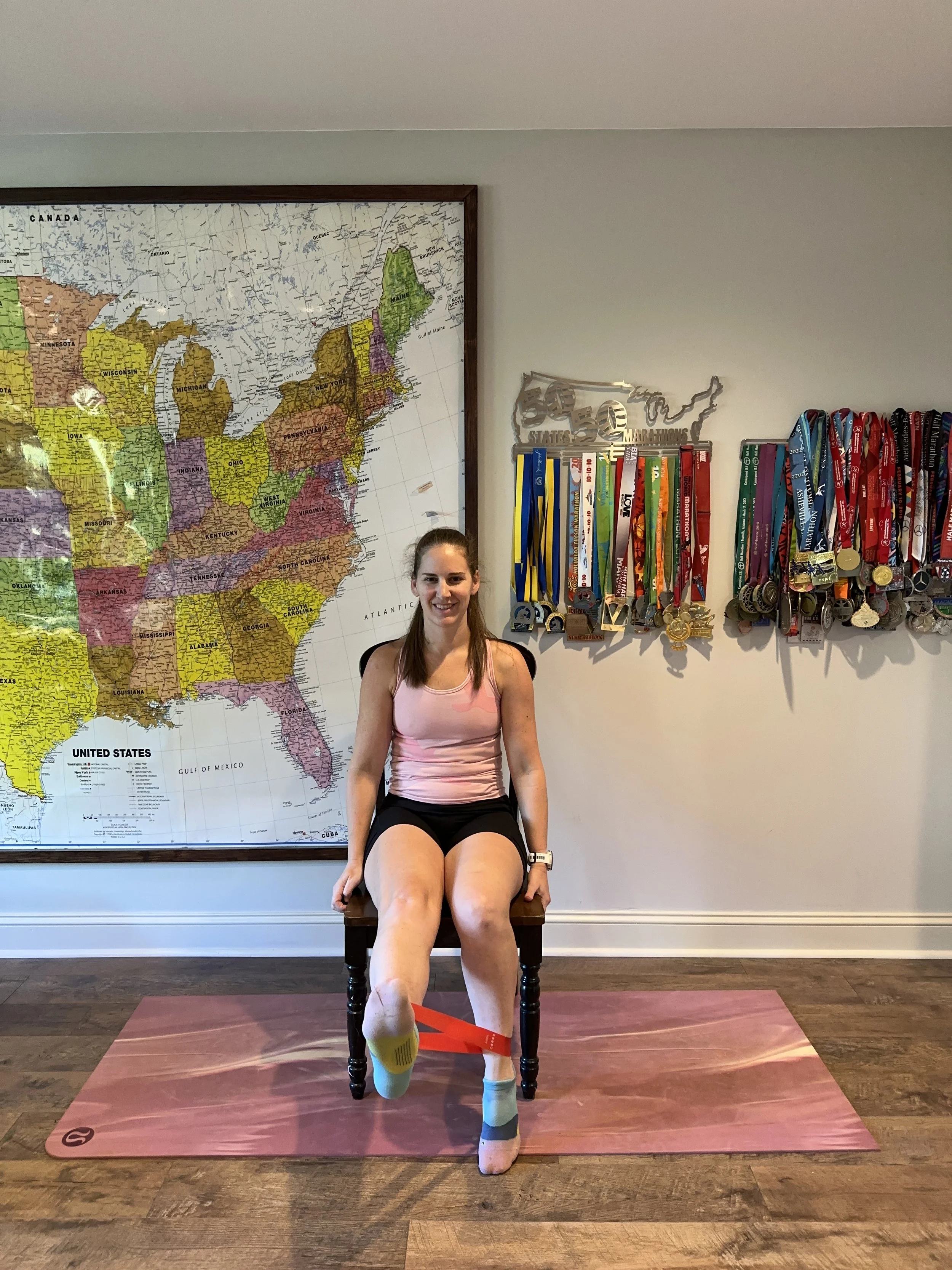 Place a band around your ankles and sit in a chair. Extend one leg straight out, pulling against the band. Repeat 20-30 times.