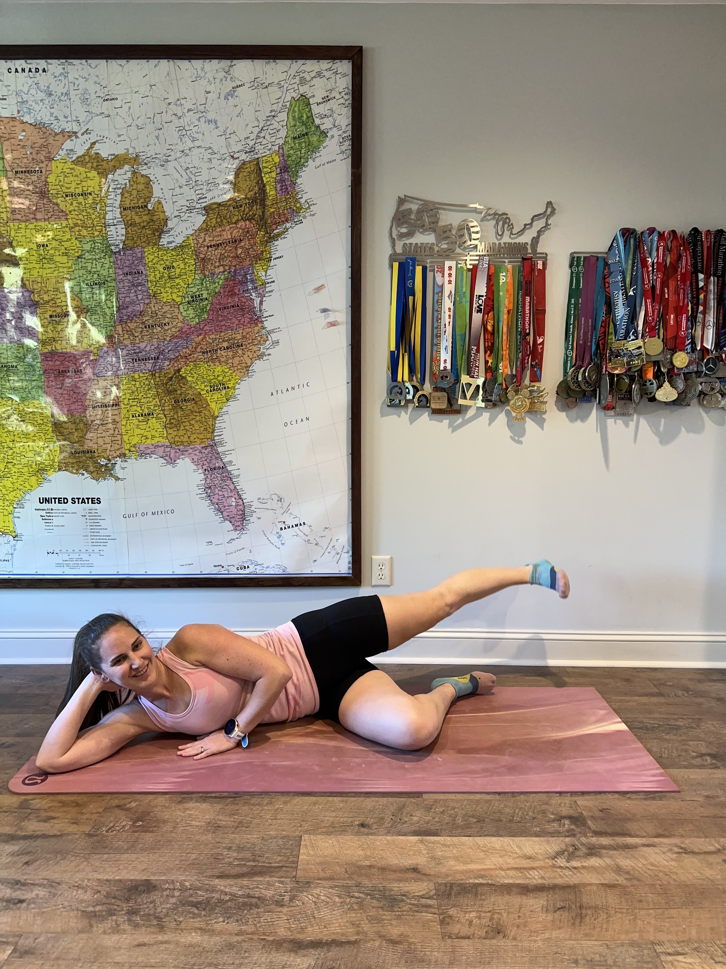Lie on your side with the bottom knee bent and the top knee straight. Keep the top leg in line with your body and lift it up off the ground, keeping your toes pointed forward. Slowly lower back down. Repeat 15-20 times on each side.