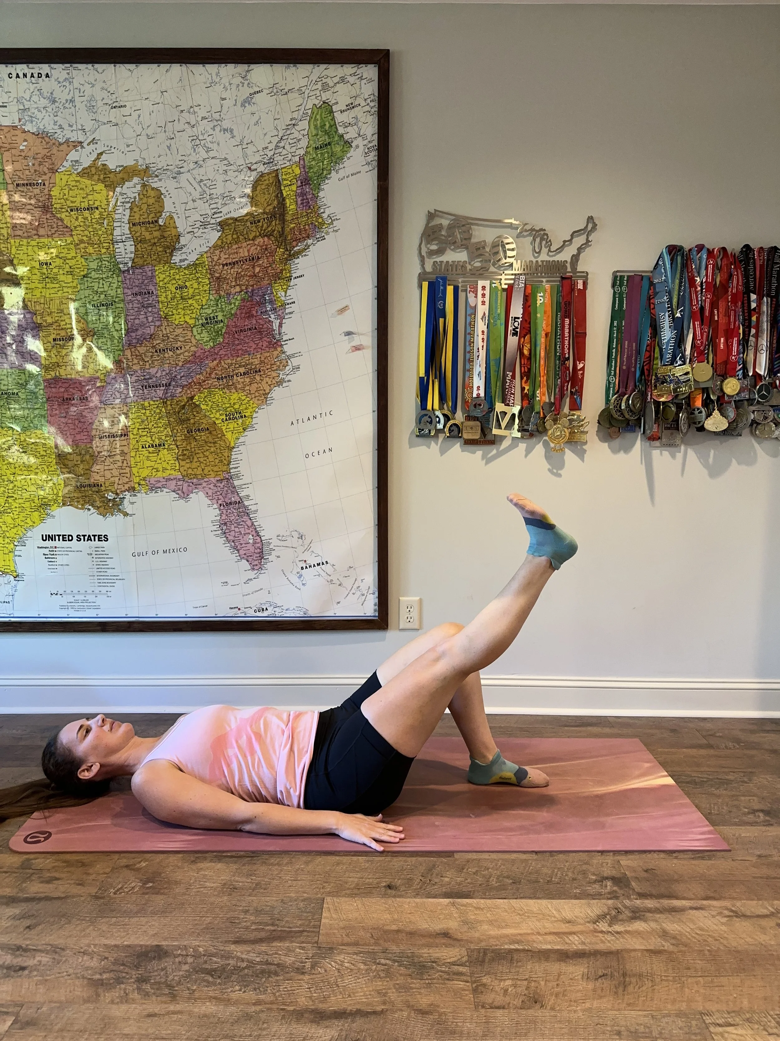 Lie on your back with one knee bent and the other knee straight. Pull your toes back towards you on the straight leg, keep your knee straight, and lift your leg up until it's even with the opposite knee. Slowly lower it back to the ground. Repeat 15-20 times on each side.